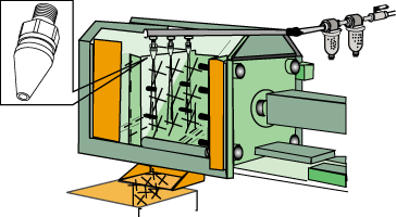 AiRTX model 48009 nozzle uses a minimal amount of compressed air to produce high volume and calling for quick parts release. Small size and instant on/off make it ideal for molding machines.