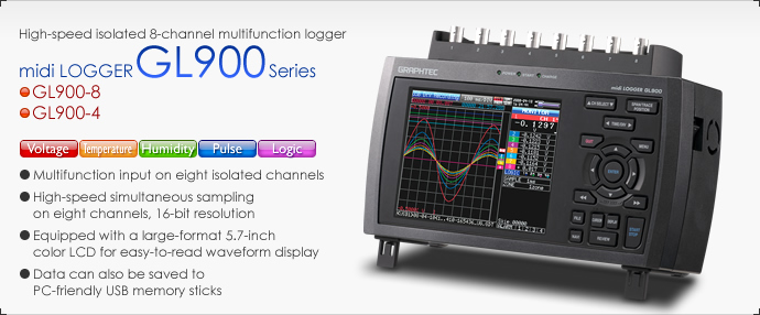 An easy-to-use upright device enabling isolated 8-channel multifunction input, the GL900 is capable of performing high-speed simultaneous measurements of voltage, temperature, and various other phenomena.