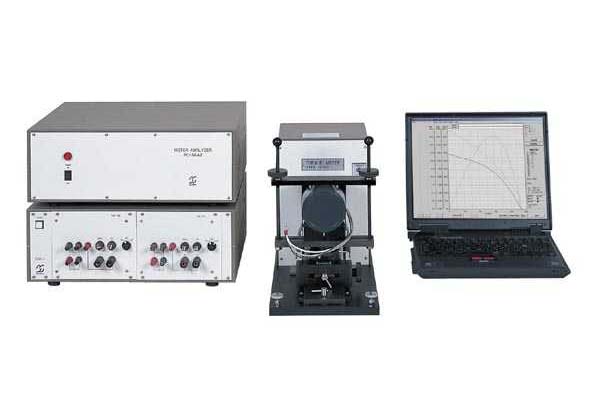 This model measures speed and torque characteristics and power output up to 30,000 r/min in compact DC motors with start up torques of 1 mN·m or less, uploading these measurements to a personal computer running Windows. Adding a voltage/current measurement component allows the model to measure voltage and current.